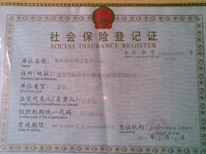 順發保潔社會保障登記證書